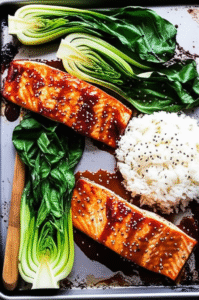 Sheet‑Pan Salmon with Bok Choy & Rice (miso‑soy glazed)